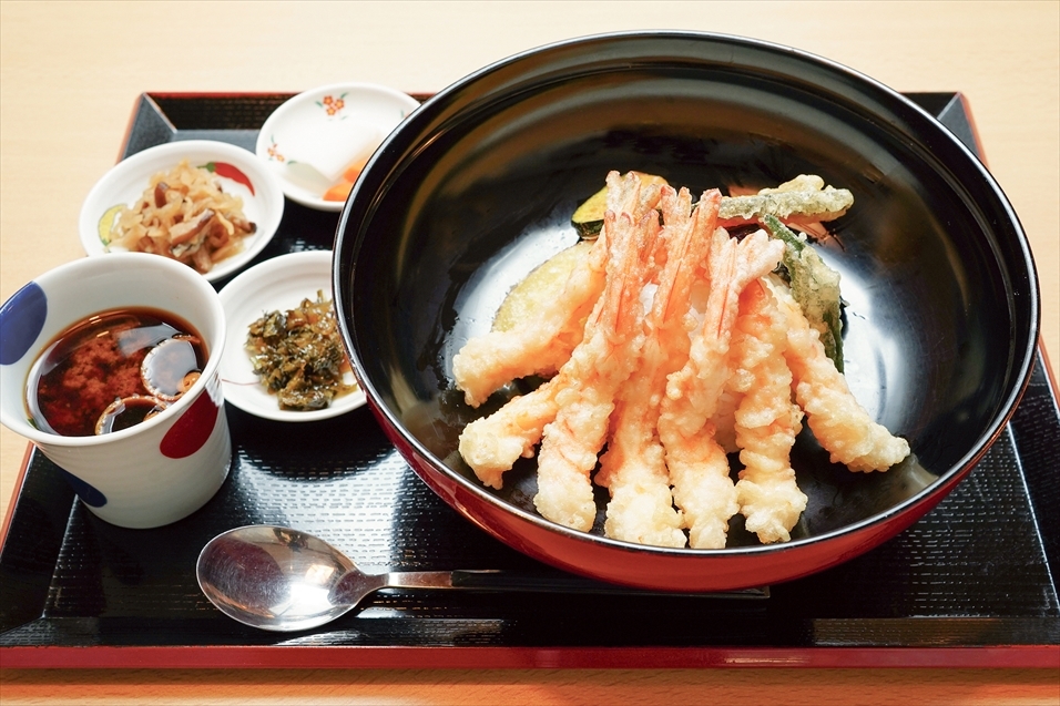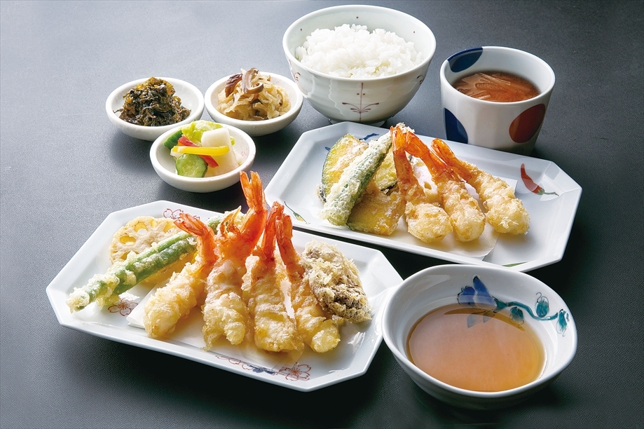 大海老×2、海老×2、白身魚×1、野菜×4、ご飯、赤だし、お惣菜