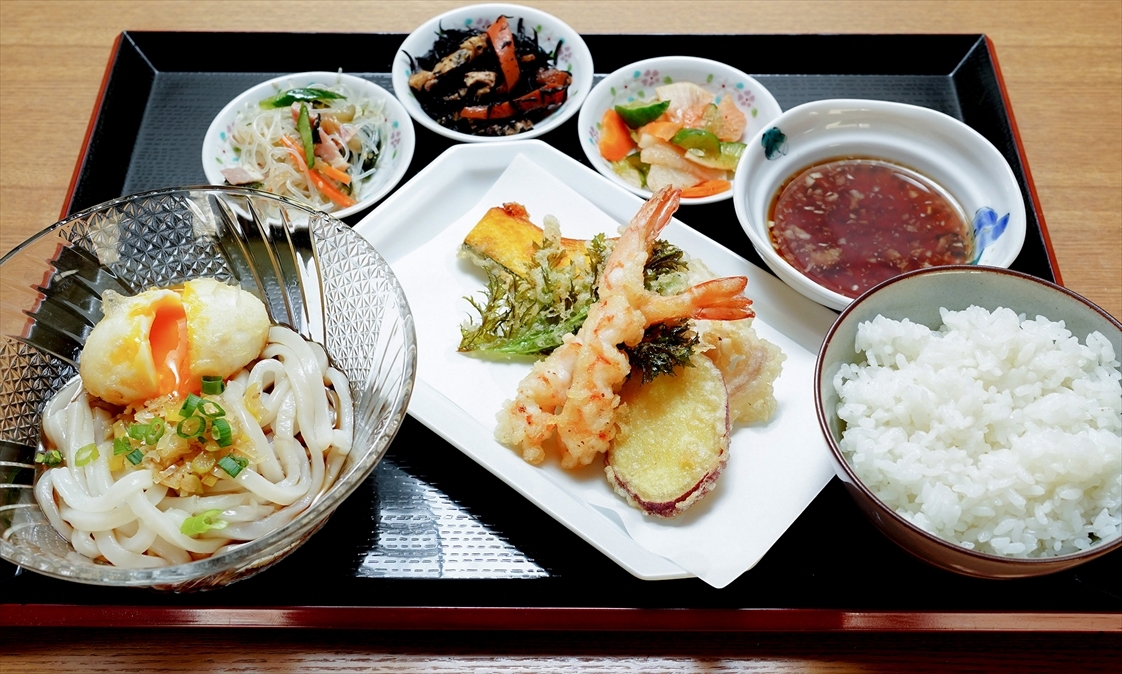 海老×2、鳥×1、野菜×3、半熟たまご天ぷら×1、ご飯、お惣菜